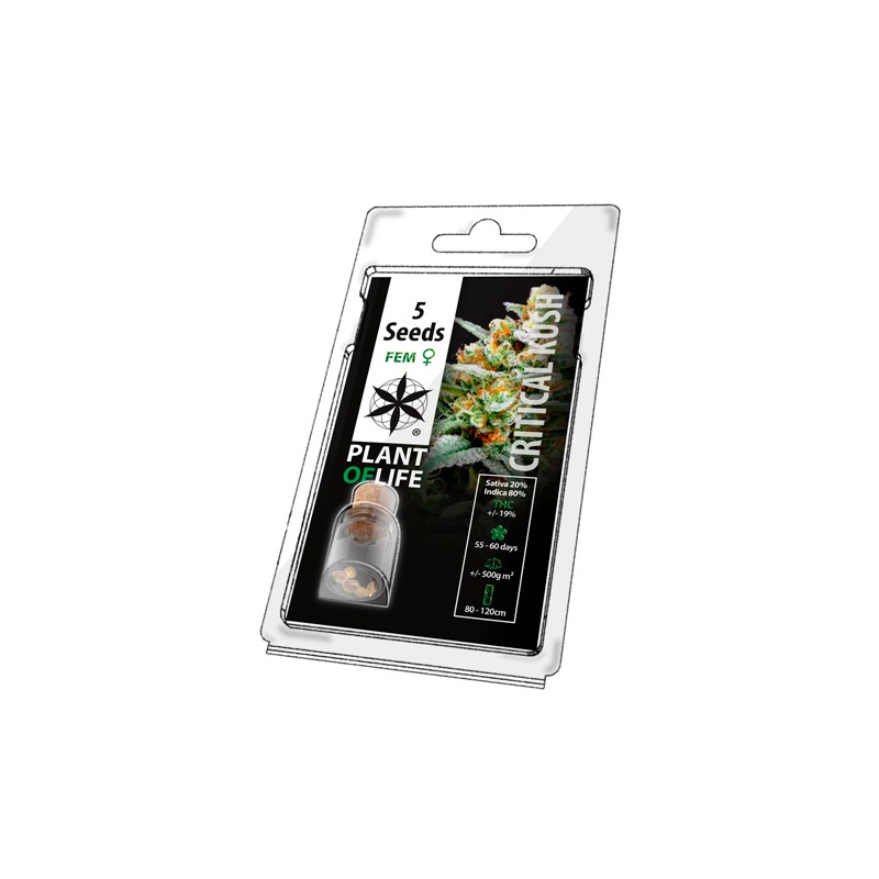 PLANT OF LIFECRITICAL+FEMINIZEDGENETICS: SATIVA 20% INDICA 80%FLOWER PERIOD: 58 DAYSYIELD: 450-900G/M2STATURE: 80-220CM18% THC