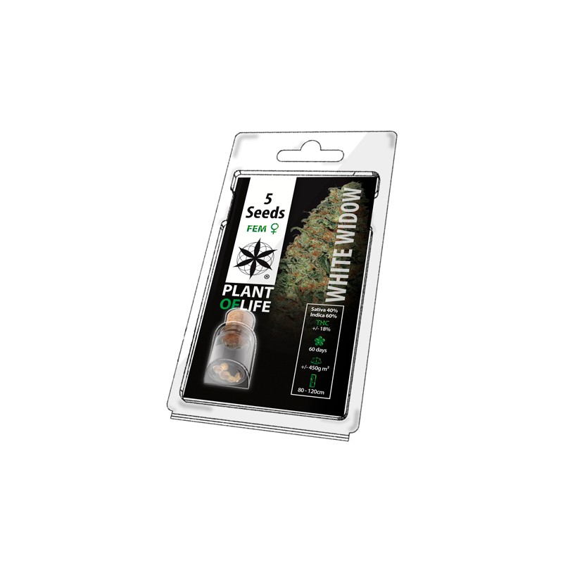 PLANT OF LIFEWHITE WIDOWFEMINIZEDGENETICS: SATIVA 40% INDICA 60%FLOWER PERIOD: 60 DAYSYIELD: 450G/M2STATURE: 80-120CM18% THC